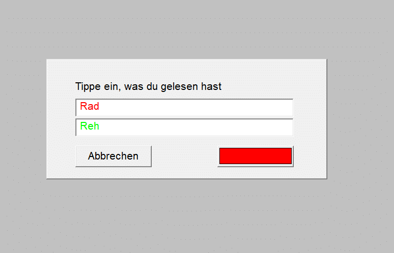 Das angezeigte Wort muss eingetippt werden. Die Anzeigedauer der Wörter wird so gewählt, dass ein einem Durchgang einige wenige Fehler passieren können. Wird alles richtig erkannt, dann die Darstellungsdauer verringert werde. Wird zu wenig richtig erkannt, erhöht man die Darstellungsdauer.